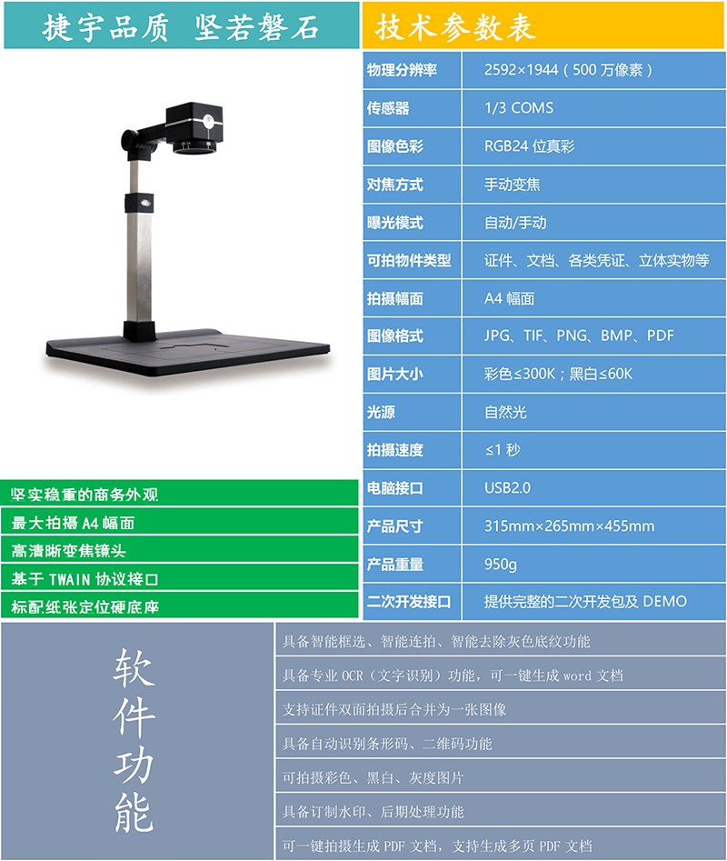 “捷宇”品牌的高拍儀產(chǎn)品可以完全取代傳統(tǒng)平板掃描儀,除了在各項性能指標(biāo)上優(yōu)于傳統(tǒng)掃描儀之外,更具備了體積小、無機(jī)械損耗、不用外接電源等傳統(tǒng)掃描儀無法實現(xiàn)的優(yōu)點!