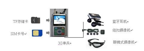 隱蔽型3G單兵專門隱蔽場合的干警設(shè)計,所有組件都小型化,由3G視頻服務(wù)器、TF卡*2、SIM卡、藍(lán)牙耳機、紐扣攝像機或眼鏡式攝像機、理電池等功能組件構(gòu)成。
